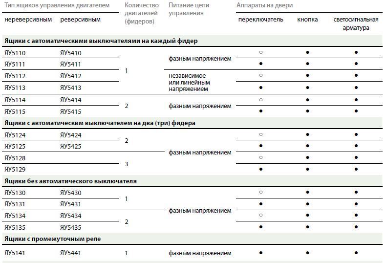 Аппаратура управления устанавливается в корпусе устройства на специальной панели и на двери с внутренней стороны. Внизу корпуса предусмотрены отверстия для ввода проводов, кабелей и труб. Аппаратный состав ящиков управления серии ЯУ: − в качестве коммутационной аппаратуры в ЯУ используются магнитные пускатели импортного и отечественного исполнения; − для защиты силовой цепи от короткого замыкания в ЯУ применяются автоматические выключатели защиты двигателя импортного и отечественного производства с комбинированными расцепителями. Для ящиков ЯУ5130–5135 и 5430-5435 защитный аппарат устанавливается вне ящика (например, в распределительном пункте); − для защиты электродвигателей от перегрузки и работы с одной отключенной фазой применяются тепловые реле.